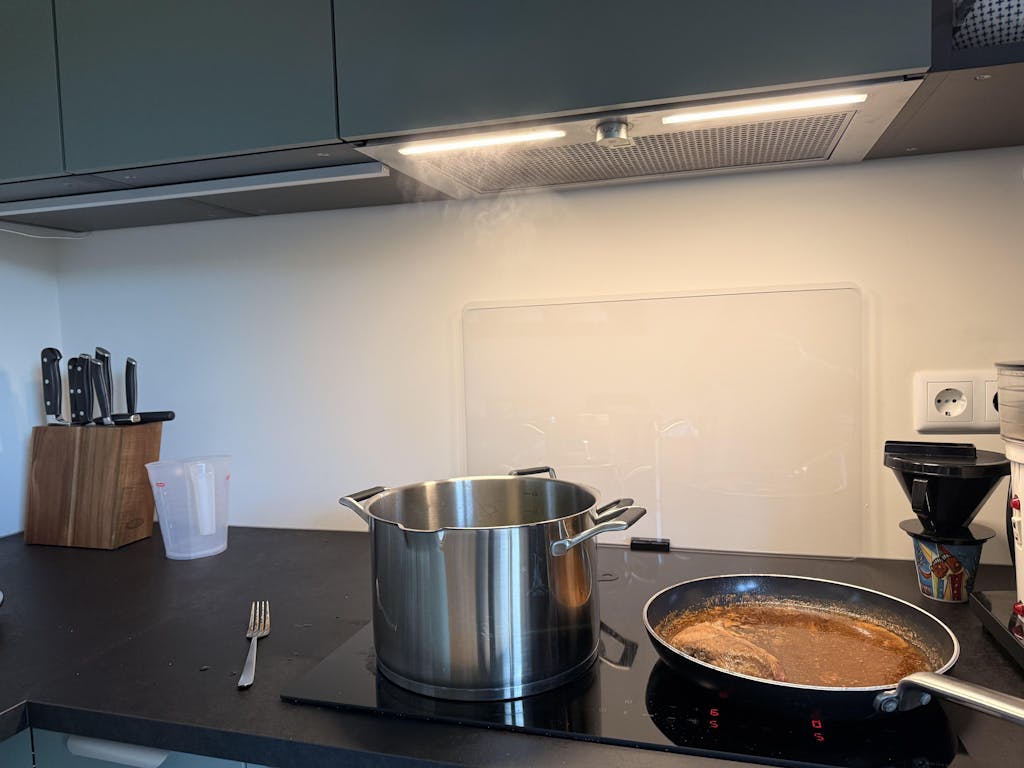 Searching for a quick solution keeping the wall behind the inductionplate clean Stoveblock Splash guard is the best investment ever. Easy assembly, looks good and no splashes from cooking on the wall. Super product.
